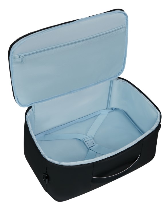 Hlavní prostor má elastické pásy na upevnění oblečení spojené plastovou přezkou a 1 větší zipovou kapsu