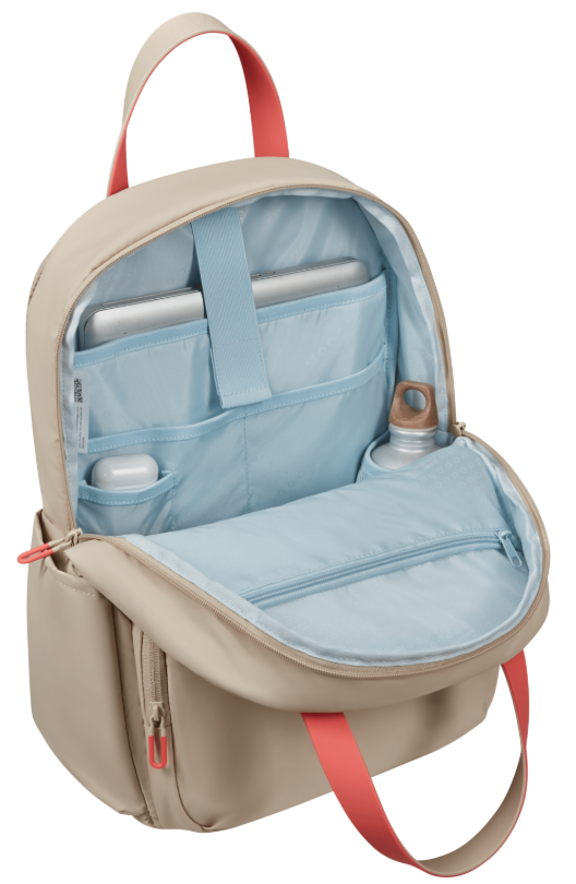 Uvnitř se nachází jedna volná kapsa na notebook 15,6", dvě menší volné kapsy, menší kapsička např. na sluchátka a síťovaná kapsička vhodná např. na láhev a jedna velká zipová kapsa