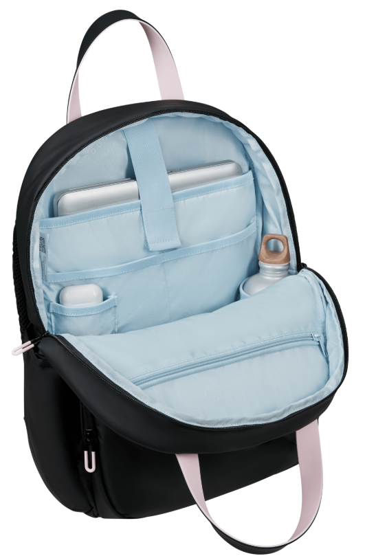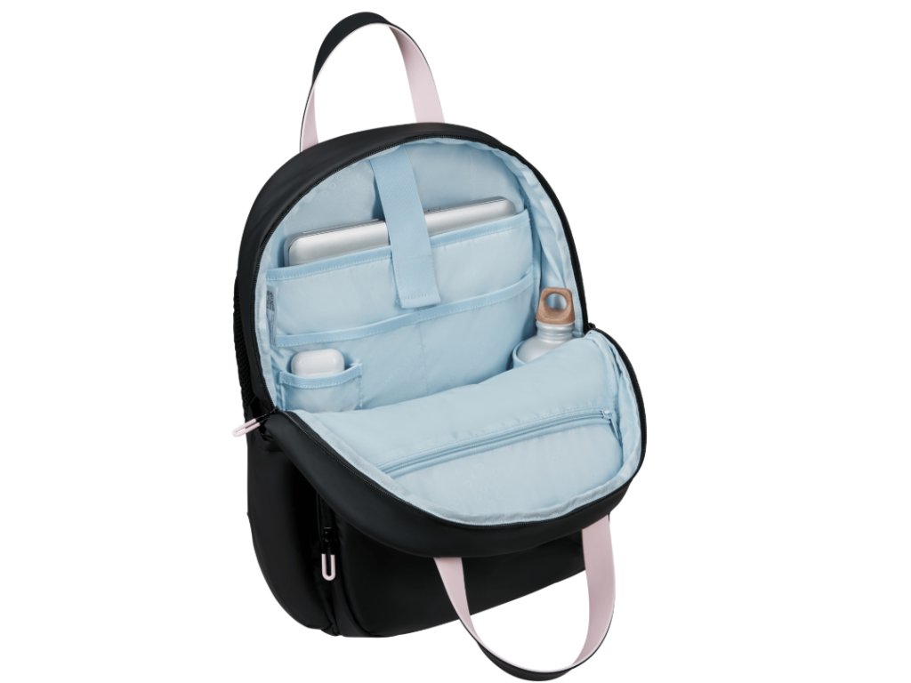 Uvnitř se nachází jedna volná kapsa na notebook 15,6", dvě menší volné kapsy, menší kapsička např. na sluchátka a síťovaná kapsička vhodná např. na láhev a jedna velká zipová kapsa