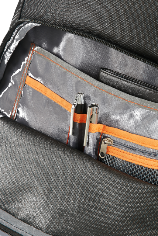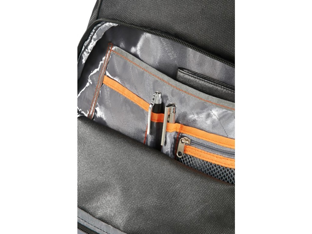 Na čelní straně batohu se nachází jedna větší kapsa, která slouží jako organizér, jsou zde kapsičky a přihrádky na propisky, dále na čelní straně najdete další zipovou kapsu