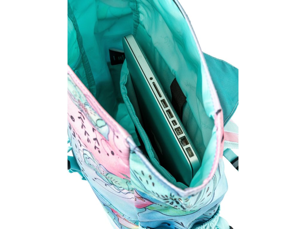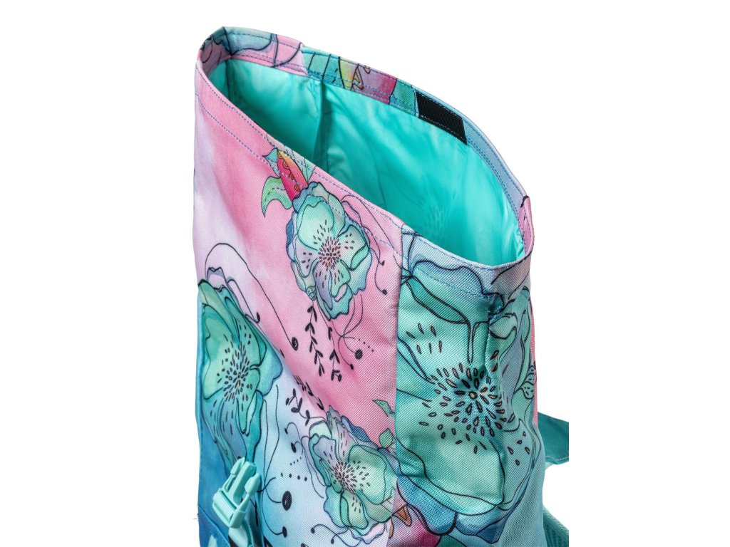 Batoh kombinuje romantický květinový motiv s praktickou rolovací konstrukcí – ideální společník do města, do školy i na víkendové výlety 🌸🎒.