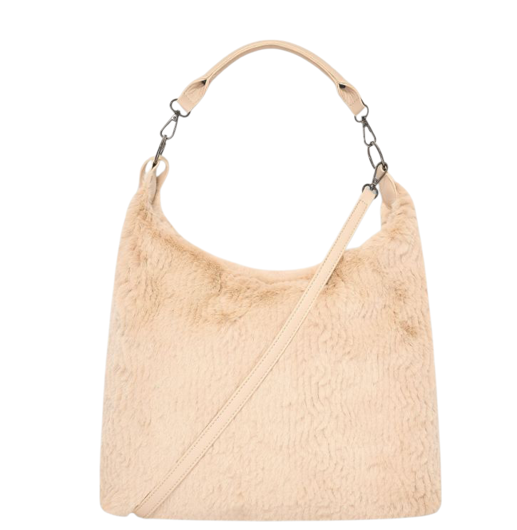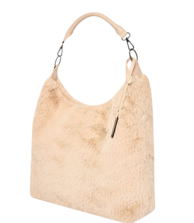 -Tato nadýchaná prostorná kabelka z umělé kožešiny v barvě šampaňského je ideální pro každodenní nošení.