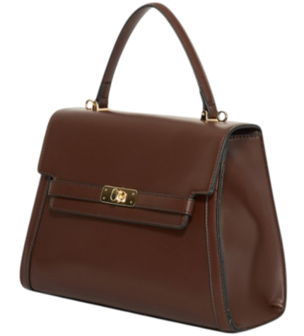 Kabelka má tmavě hnědý odstín a uzavírá se klopou na otočný zámek