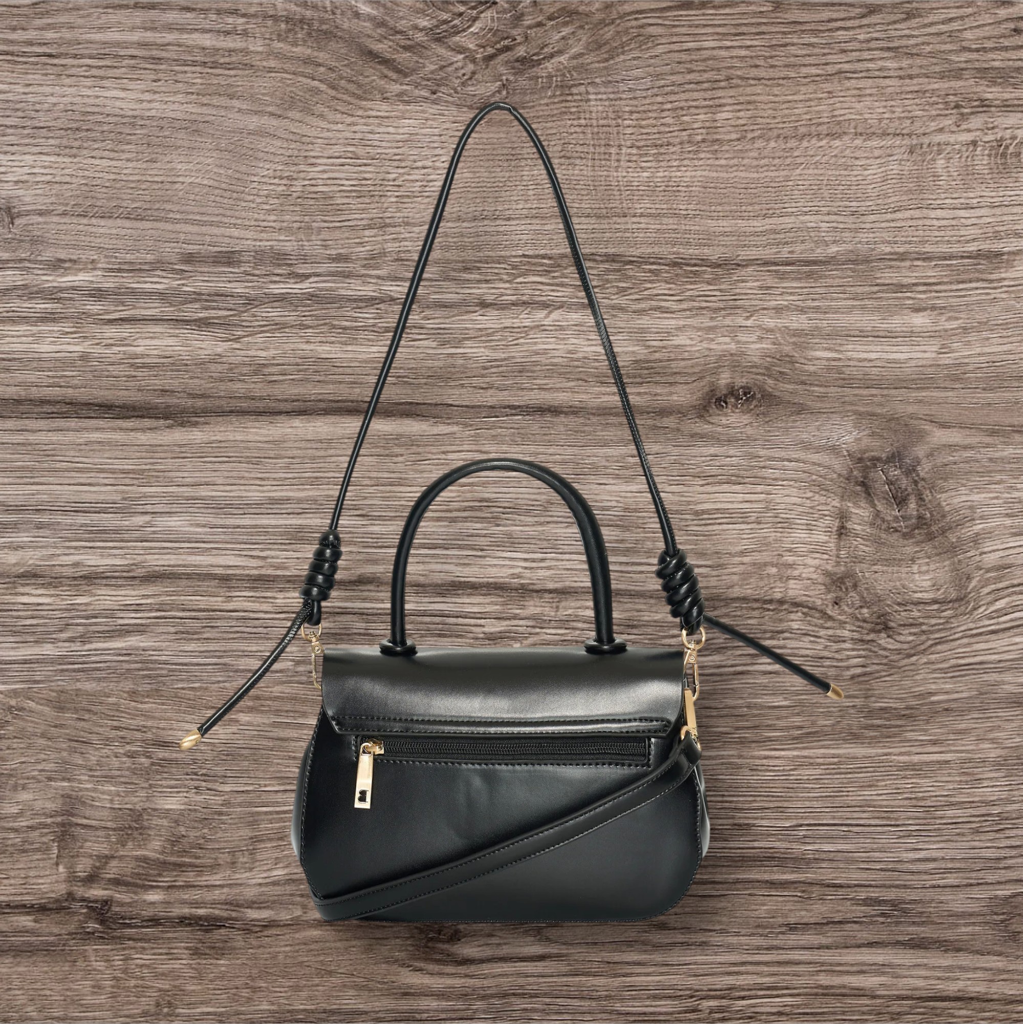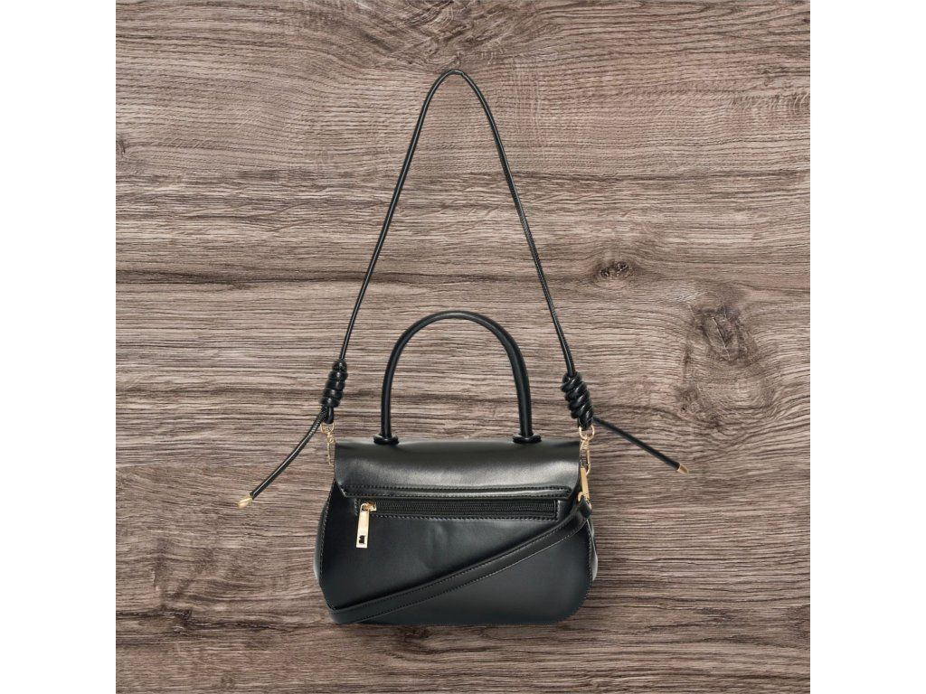 Kabelka má černý odstín a uzavírá se klopou na otočný zámek