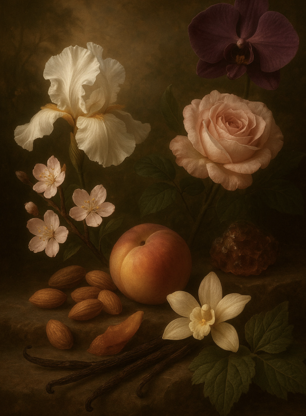 Tato exkluzivní vůně vás provede smyslným olfaktorickým zážitkem: vůně se otevírá výraznou a zároveň jemně sladkou notou mandle hořké, která se prolíná s květinovým srdcem z iris, jasmínu, orchideje, broskve a růže. V závěru se aroma usadí na hlubších tónech dřev arganu a cedru, propojených s teplou smyslností ambra, pačuli a vanilky – pro dlouhotrvající a elegantní aroma ve vašem interiéru.