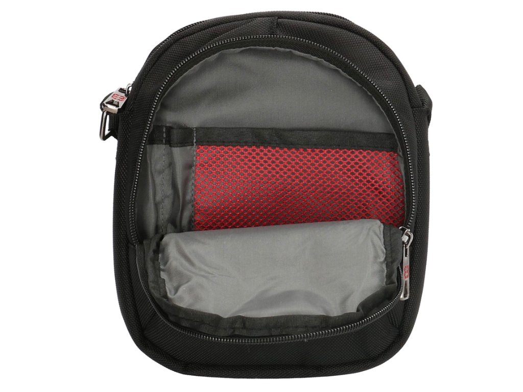V menší přední kapse je jedna síťovaná přihrádka a poslední přihrádka se zipem je na zadní straně tašky.
