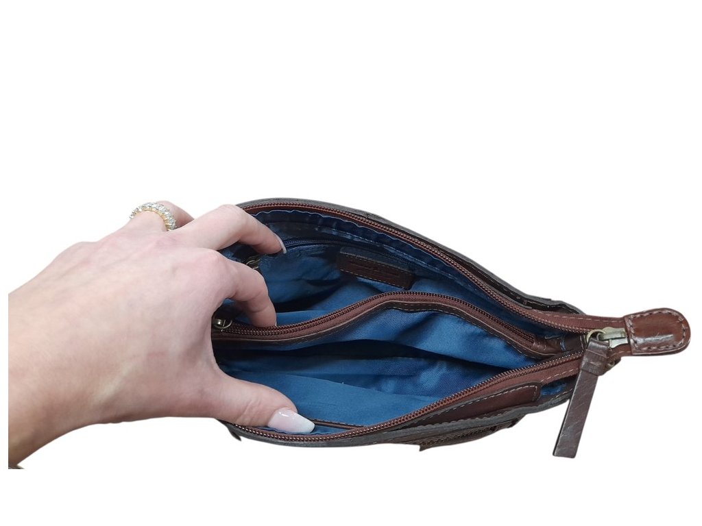 Kabelka má uvnitř zipovou dělící přepážku, 1 volnou kapsičku a 1 zipovou