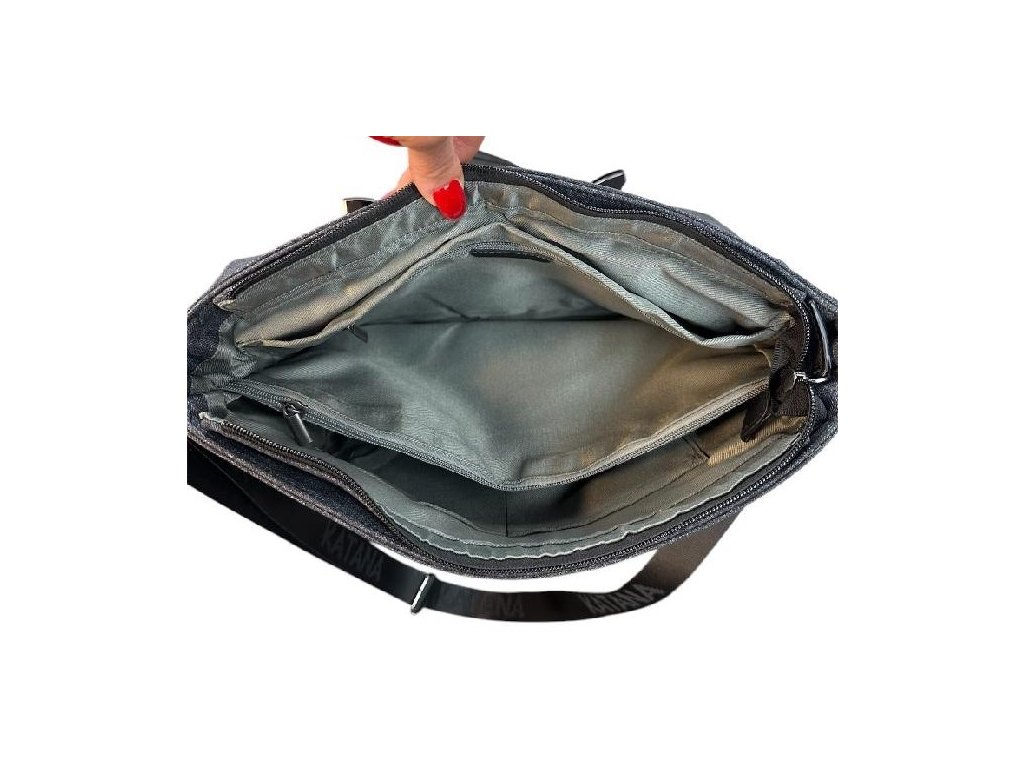 Uvnitř jsou dvě volné kapsy, zipová přepážka, jedna volná kapsa a na ní ještě kapsa na zip