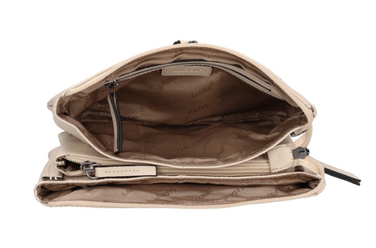 Uvnitř je rozdělena na 3 přihrádky- 2 přihradky jsou volné uvniř je zipová kapsa v podšívce a 1 volná kapsa na drobnosti a 1 zipová přihrádka