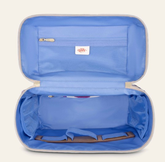 Kosmetický kufřík má nahoře pevnou rukojeť mpro snadné přenášení