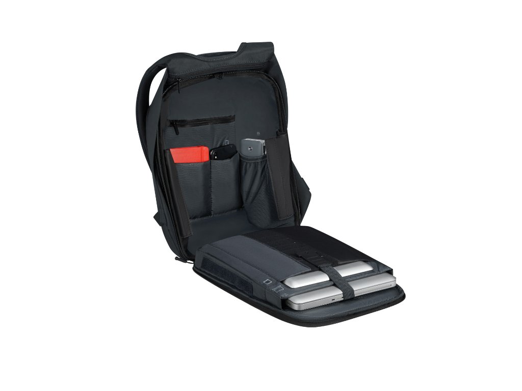 Uvnitř najdete volné kapsičky na různé drobnosti, na mobil, láhev apod., dále přihrádky na karty, propisky a kapsy na tablet a notebook, port pro USB nabíjení