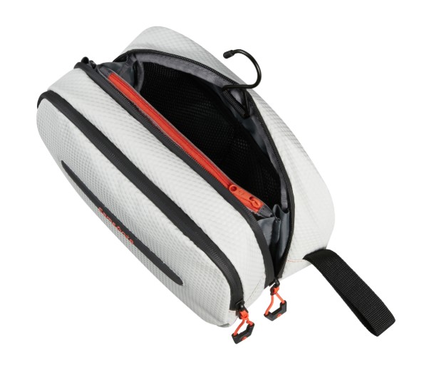 Další zipová kapsa je prostorná je rozdělena uprostřed zipovou voděodolnou kapsou, dále jsou zde 2 prodyšné kapsičky a háček pro možnost zavěšení etue