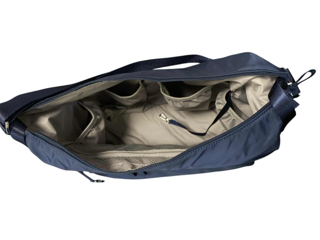 Uvnitř kabelky je jedna většší síťovaná kapsa na zip a 4 volné kapsy s penvou gumou na potřebné věci