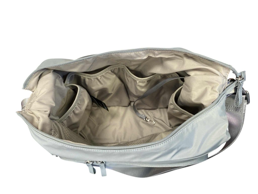Uvnitř kabelky je jedna většší síťovaná kapsa na zip a 4 volné kapsy s penvou gumou na potřebné věci
