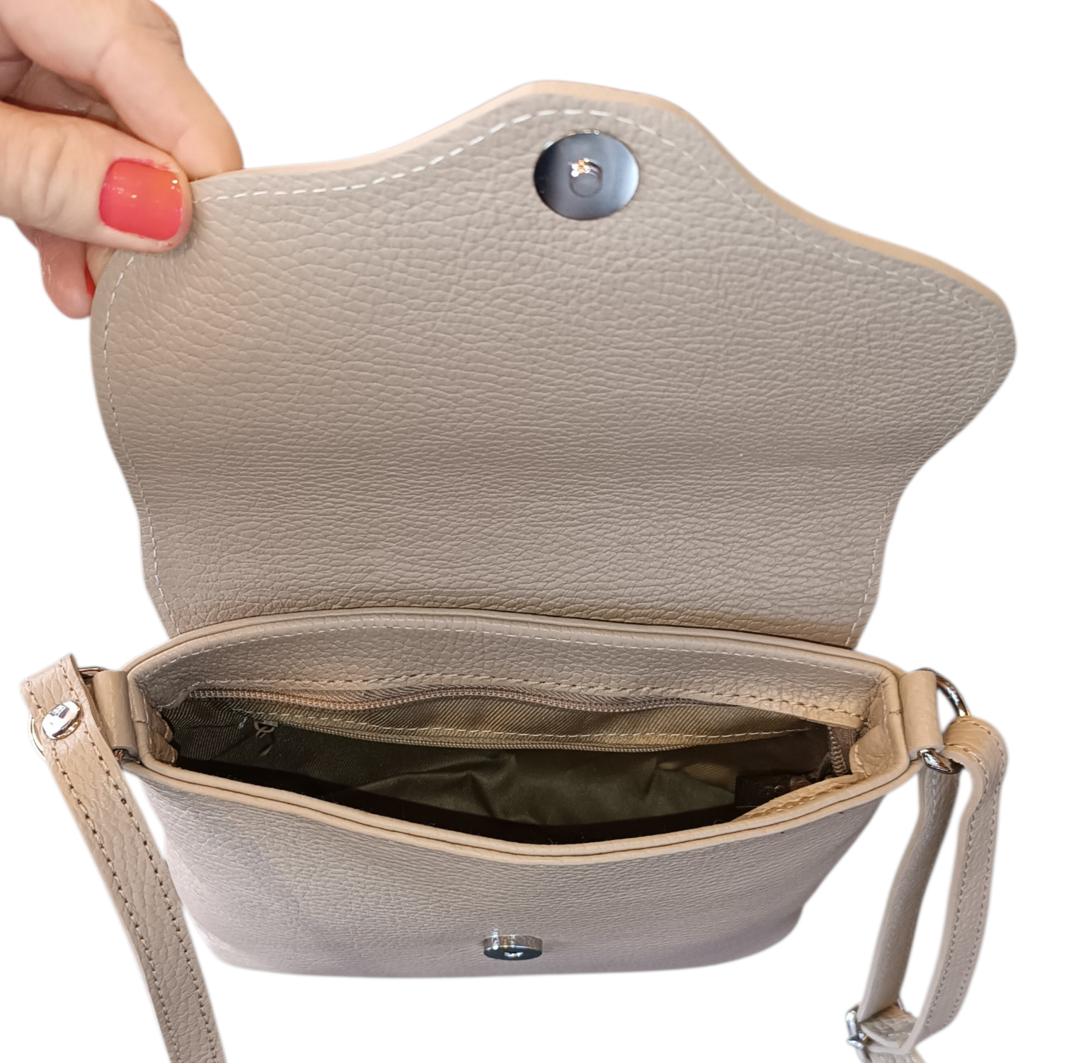 Kabelka se uzavírá na zip a klopou na druk
